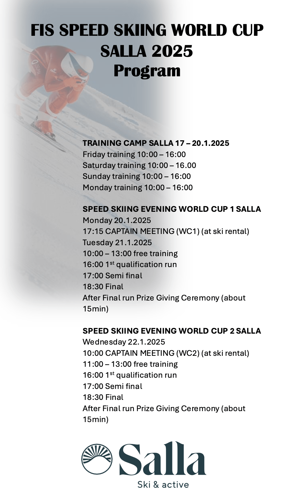 Sallassa järjestetään tammikuussa 21. ja 22. päivä FIS Speed Skiing World Cup -osakilpailu. Tapahtumaviikko alkaa jo edeltävällä viikolla 17.1. harjoitusleirillä, ja huipentuu 21. ja 22. järjestettäviin osakilpailuihin. Tervetuloa seuraamaan, kun maailman nopeimmat laskijat saapuvat Sallaan! Tarkemmat aikataulut alapuolella. Korjauksena aikatauluun vapaa harjoittelu kisapäivinä alkaa vasta klo 12:00 ja karsintakierros alkaakin jo 15:30.